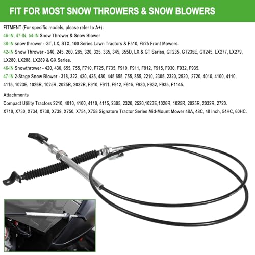 Click for More Images APPLICATION: This remote spout control cable kit is fit for 38'', 42'', 46'', 47'', 47'' 2 stage, 54'' snow throwers & snow blowers. Fit for X710, X730, X734, X738, X739, X750, X754, X758, Signature Tractor Series. The cable...